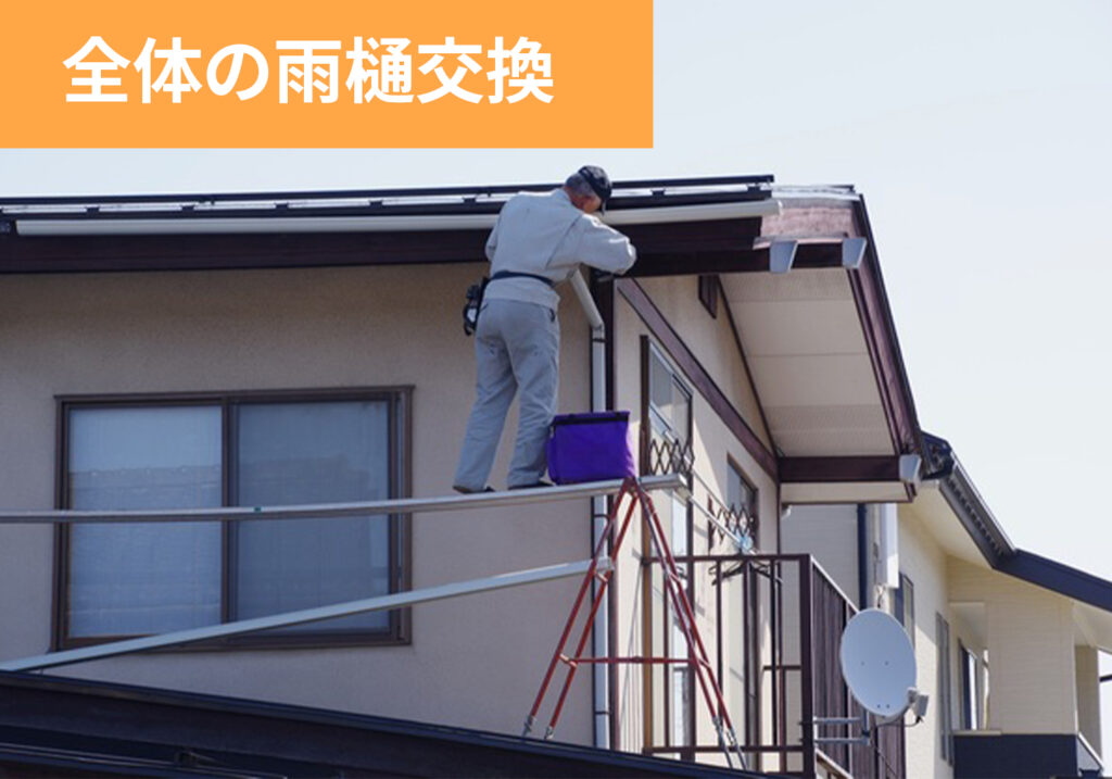 当社が提供している「雨樋修理プラン」は部分的な雨樋修理から古くなった雨樋の全交換まで対応した雨樋修理に特化したサービスとなっております。部分的な修理では出来るだけ足場を使わないように梯子や脚立、もしくは屋根に登らせてもらい修理を行います。足場を組むと1棟で20万円ほどかかってしまうため、出来るだけコストを抑えた修理方法をご提案しております。