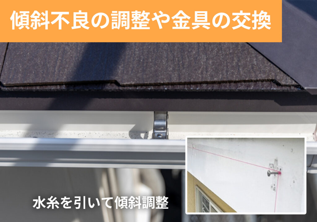 雨どいを固定している軒樋金具も必要に応じて取り外します。排水するために適切な勾配が必要になりますので、水糸を張り、その位置に正確に軒樋金具を取り付けていきます。