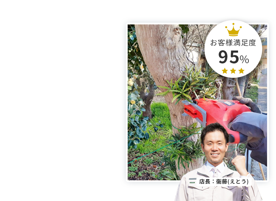 メッセージ:自身も長年戸建てに住んでいるがゆえに様々なお家のお困りごとを体験してきました。その中でも庭木伐採はどこに頼めばいいのか分かりづらいものだと思います。「庭先の小さな植木1本だけ伐採をお願いしたいのだけど」とご相談頂くことも多いです。当店では大きさや場所に関わらず1本の伐採から親身に対応致します。お客様のお悩みを迅速かつ適切に解決することが、私たちの喜びです。誠心誠意作業をいたしますので、まずはお気軽にご相談ください。