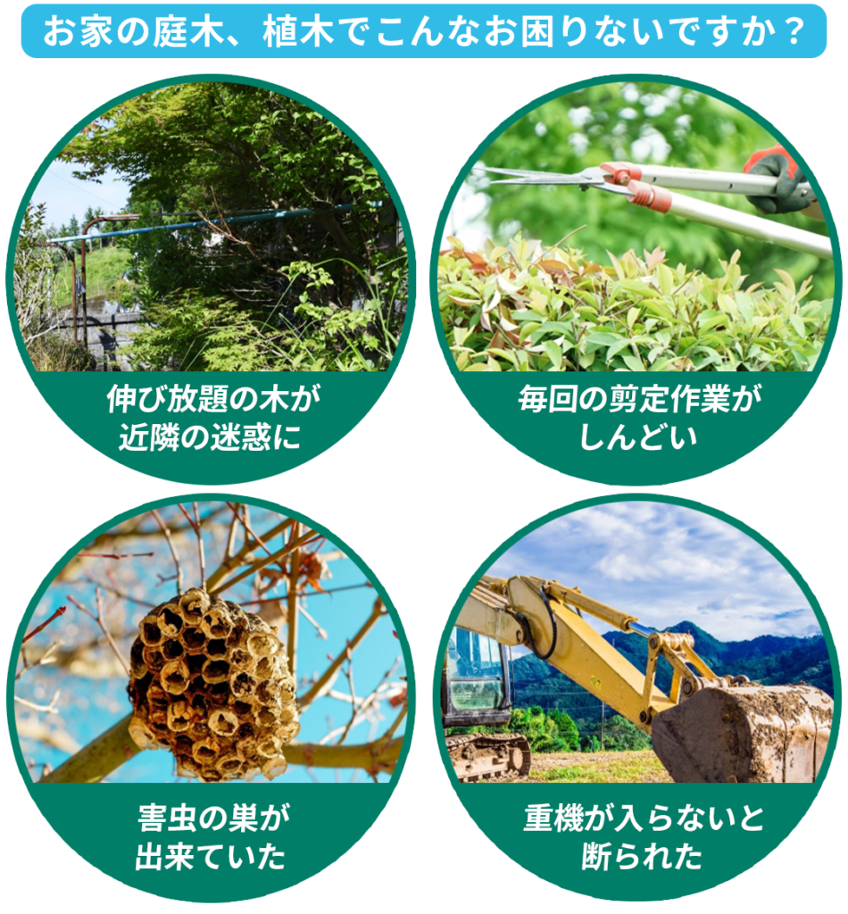 大きく育って、ほったらかしの庭木はご近所さんの敷地に侵入したり、道路まで伸びて通行人にケガをさせてしまったり、ハチやシロアリの巣になったりとトラブルを起こしてしまいます。また、伐採を検討して業者に連絡をしたが「重機が入らないので出来ない」とお断りされて困っているという方もいらっしゃいます。