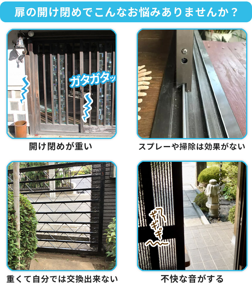 また、サッシや引き戸・門扉は想像以上に重く、外したり持ち上げたりする作業中に指を挟む・落としてケガをするリスクがあります。無理に動かすとレールを削ったり、枠を歪ませて症状が悪化することも。戸車は種類・サイズが多く、「買ったけど合わない」「左右や形状が違う」など部品選びで二度手間になるケースも少なくありません。