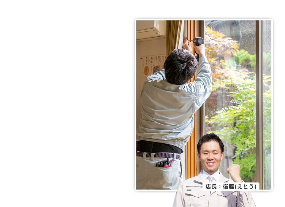 メッセージ:窓は、日々の生活に欠かせない存在ですが窓の性能が暮らしの快適さを大きく左右することは見落とされがちです。私たちは、窓のリフォームを通じて、一年中快適で、省エネにも貢献する暮らしを提案します。健康への不安を減らし、安心・安全な住環境を整え、笑顔あふれる毎日をサポートします。